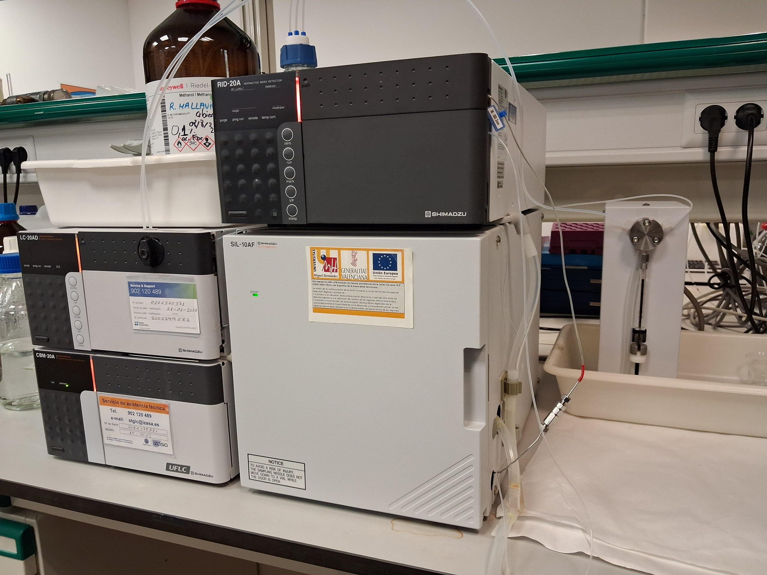 Sistema de Cromatografía Líquida HPLC-GPC QP2010 Series Simadzu con inyección automática y detector de índice de refracción RID-10A. Este equipo básico de cromatografía se complementa con las columnas específicas de permeación en gel empleadas en la determinación de pesos moleculares. En estos momentos el equipo y las columnas disponibles permiten evaluar pesos moleculares de macromoléculas que sean solubles en: